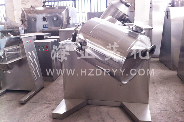 结构:该机由机座、传动系统、电器控制系统、多向运动机构、混合筒等部件组成。与物料直接接触的混合筒采用优质不锈钢材料制造,桶体内外壁均经镜面抛光。