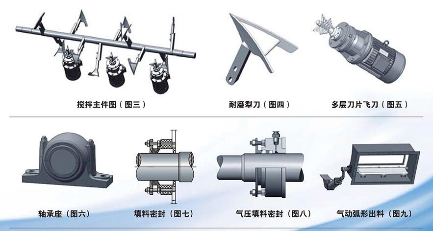 飞刀起到辅助混合和对结块料分散解聚的作用,有多层刀片的飞刀组与电机直连,标准转速一般为1440r/min;根据物料特性的差异,飞刀有多种形状和转速选择。(图五)