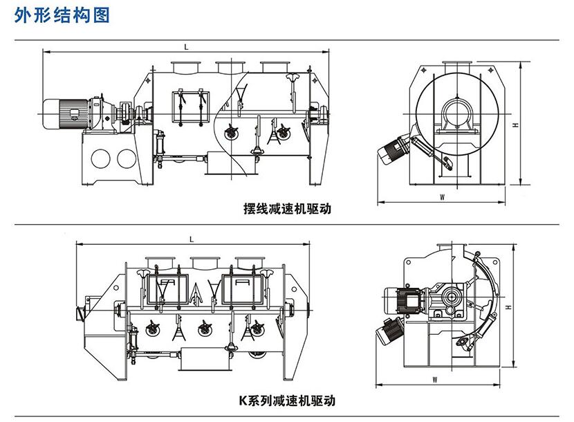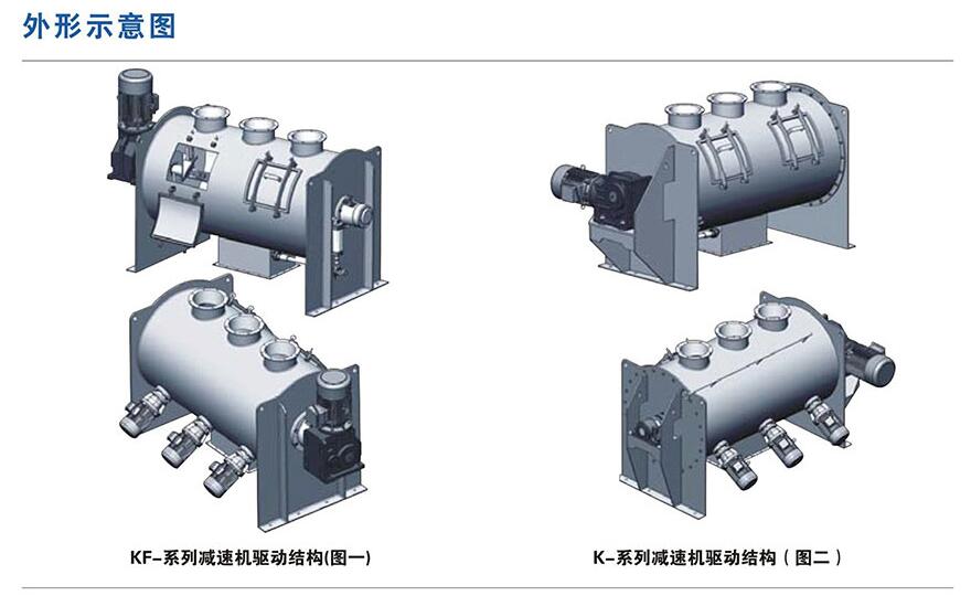 该机型有驱动机构、卧式筒体、犁刀、飞刀、四部分组成;物料在犁刀作用下沿筒壁作径向周方湍动,将物料沿犁刀两侧的法线方向抛出,产生离心涡旋运动致使受力的物料三维扩散,并彼此混合,当物料流经飞刀时被高速旋转的飞刀剪切搅拌并强烈抛散,从而在较短时间内达到均匀混合。能满足固液混合以及造湿粒、干燥等复合工艺;尤其适用于粘性或胶状添剂的混合。